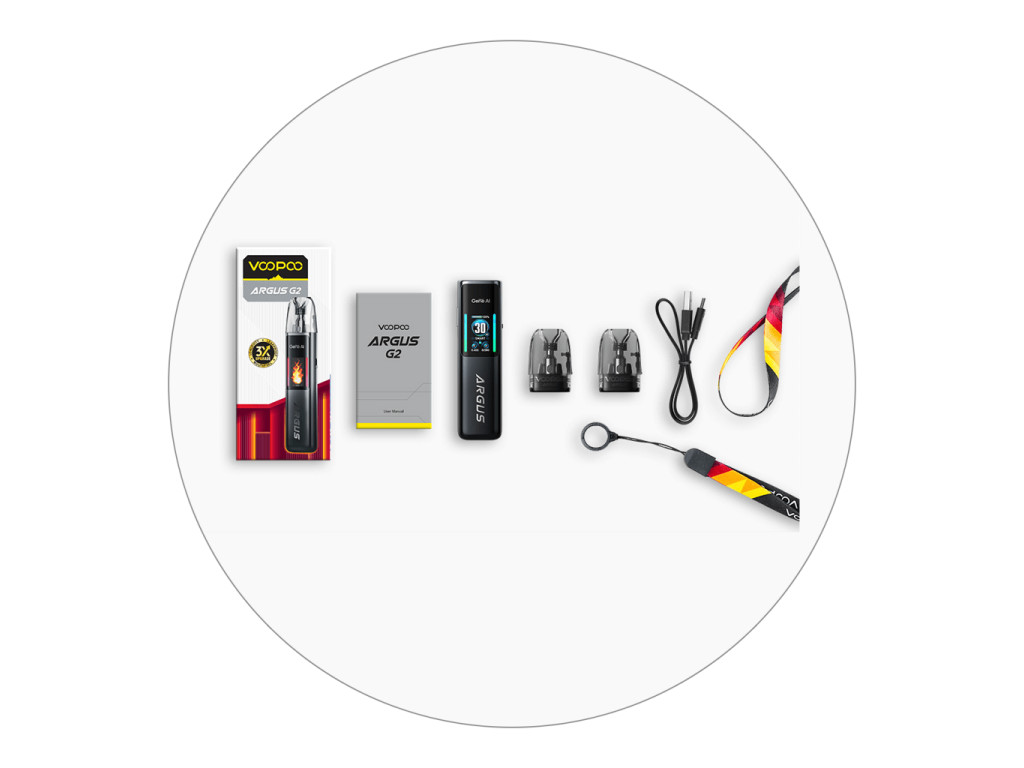 Obsah balení: | 1x VooPoo Argus G2, 2x cartridge VooPoo Argus Pod Top Fill (0.7Ω + 0.4Ω), 1x USB-C kabel, 1x šňůrka na krk, 1x návod |