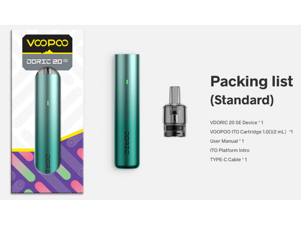 Obsah balení: | 1x VooPoo Doric SE 20, 1x cartridge VooPoo Doric ITO 1.0 ohm, 1x USB-C kabel, 1x návod |